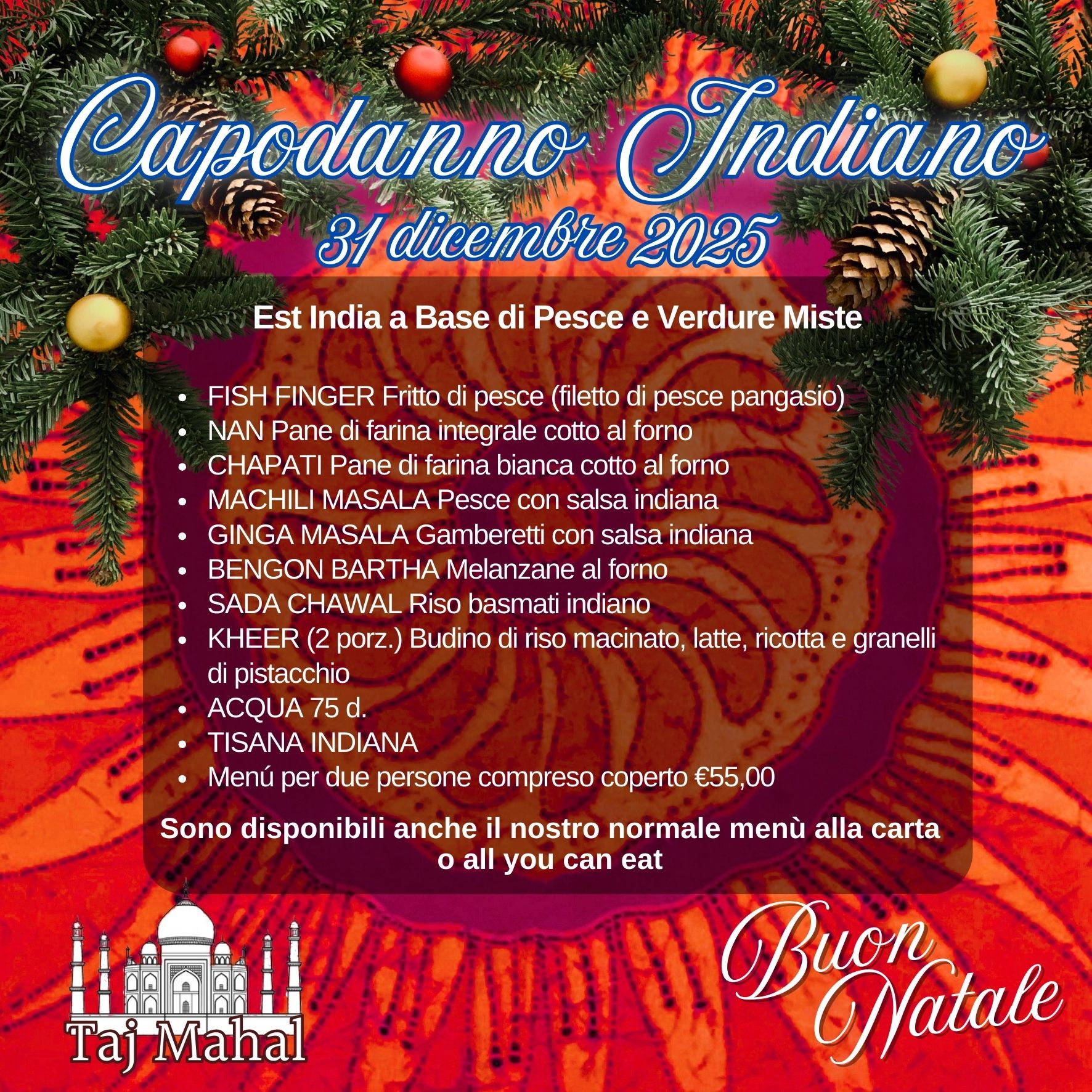 Est India a Base di Pesce e Verdure Miste: FISH FINGER Fritto di pesce (filetto di pangasio), NAAN Pane di farina bianca cotto al forno, CHAPATI Pane di farina integrale cotto al forno, MACHILI MASALA Pesce con salsa indiana, GINGA MASALA Gamberetti con salsa indiana, BENGON BARTHA Melanzane al forno, SADA CHAWAL Riso basmati indiano, KHEER (2 porz.) Budino di riso macinato, latte, ricotta e granelli di pistacchio, ACQUA 75 cl., TISANA INDIANA (Menù per due persone compreso coperto(
