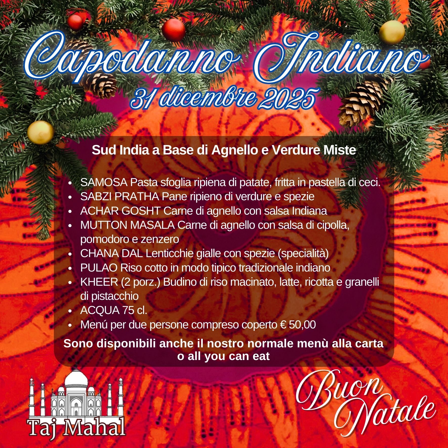 Sud India a Base di Agnello e Verdure Miste: SAMOSA Pasta sfoglia ripiena di patate, SABZI PRATHA Pane ripieno di verdure e spezie, ACHAR GOSHT Carne di agnello con salsa Indiana, MUTTON MASALA Carne di agnello con salsa di cipolla, pomodoro e zenzero, CHANA DAL* Lenticchie gialle con spezie, PULAO Riso leggermente speziato, affumicato con cipolla e cumino, KHEER (2 porz.) Budino di riso macinato, latte, ricotta e granelli di pistacchio, ACQUA 75 cl., (Menù per due persone compreso coperto)