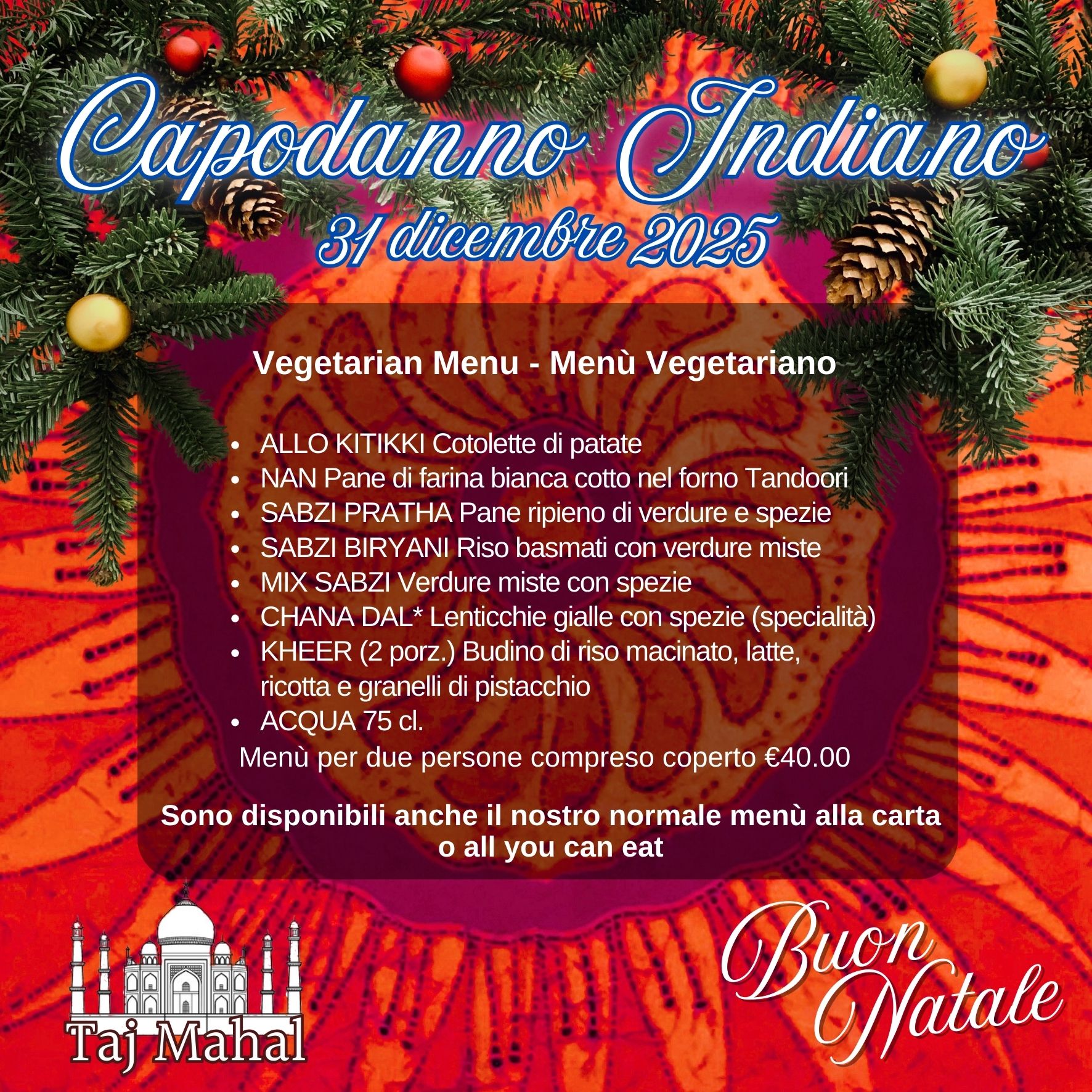MENU’ VEGETARIANO Vegetarian Menu - Menù Vegetariano: ALLO KITIKKI Cotolette di patate, NAAN Pane di farina bianca cotto nel forno Tandoori, SABZI PRATHA Pane ripieno di verdure e spezie, SABZI BIRYANI Riso basmati con verdure miste, MIX SABZI Verdure miste con spezie, CHANA DAL* Lenticchie gialle con spezie, KHEER (2 porz.) Budino di riso macinato, latte, ricotta e granelli di pistacchio, ACQUA 75 cl. , (Menù per due persone compreso coperto)